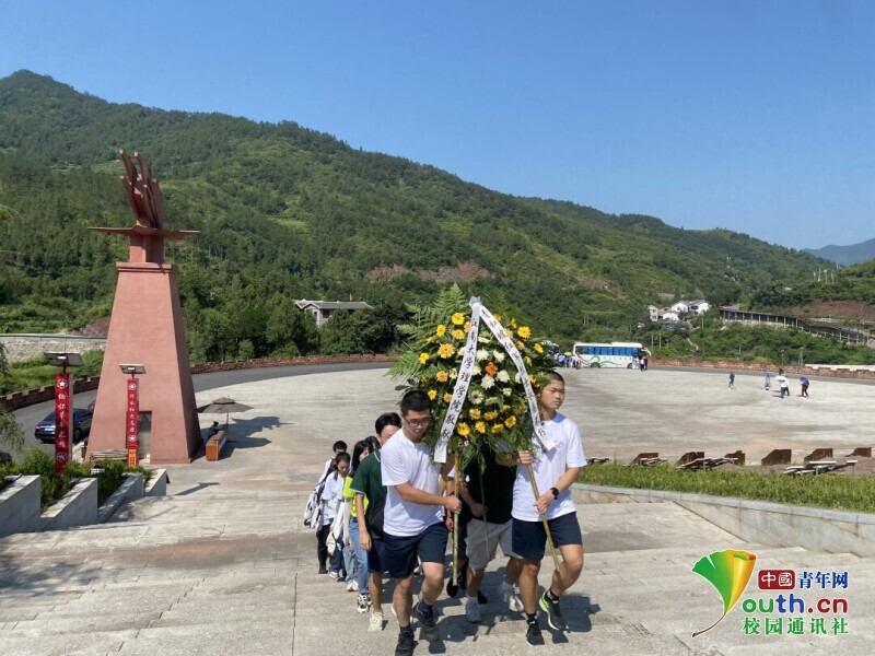 图为“蓝阶梯”乡村振兴实践团参观青杠坡战斗遗址向革命先辈敬献花篮。中国青年网通讯员 王明礼 供图