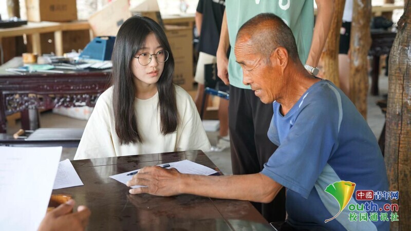 图为队员为当地百姓口述调查报告。中国青年网通讯员 朱祥瑞 摄