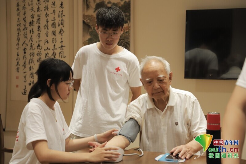 图为志愿者为安信颐和颐养中心的老人测量血压。 中国青年网通讯员 鲁钦正 摄