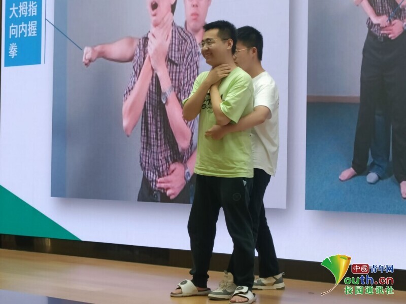 图为志愿者讲解并演示海姆立克急救法。 中国青年网通讯员 鲁钦正 摄