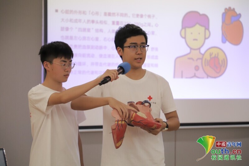 图为志愿者利用心脏模型介绍人体的血液循环途径。 中国青年网通讯员 鲁钦正 摄