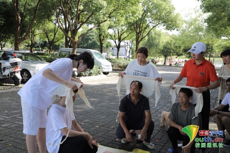 图为志愿者赴贡湖湾公园为市民讲解并演示三角巾包扎法,市民们学习实践两不误。 中国青年网通讯员 鲁钦正 摄