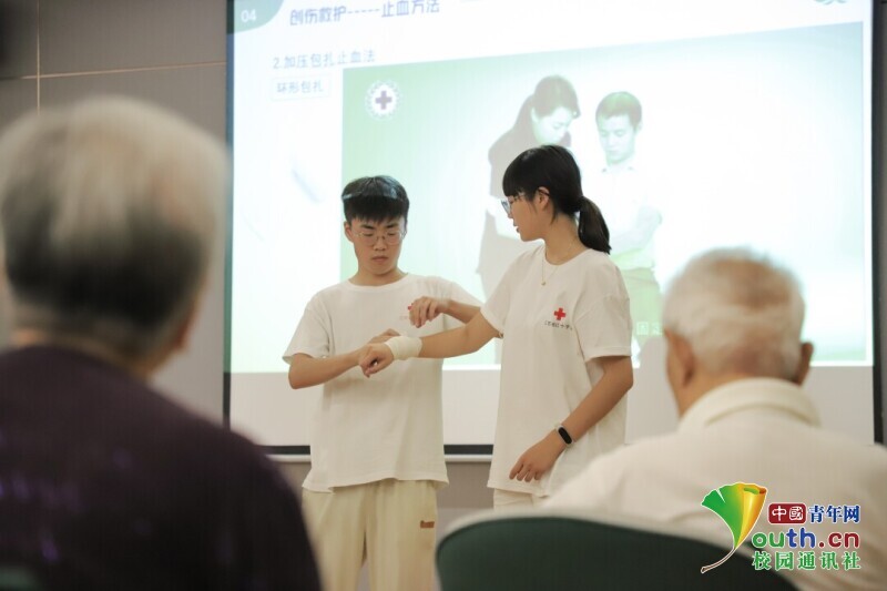 图为志愿者为先锋社区的居民讲授应对不同伤口的处理方法。 中国青年网通讯员 王婧怡 摄