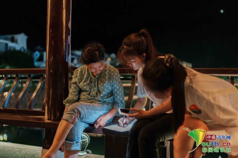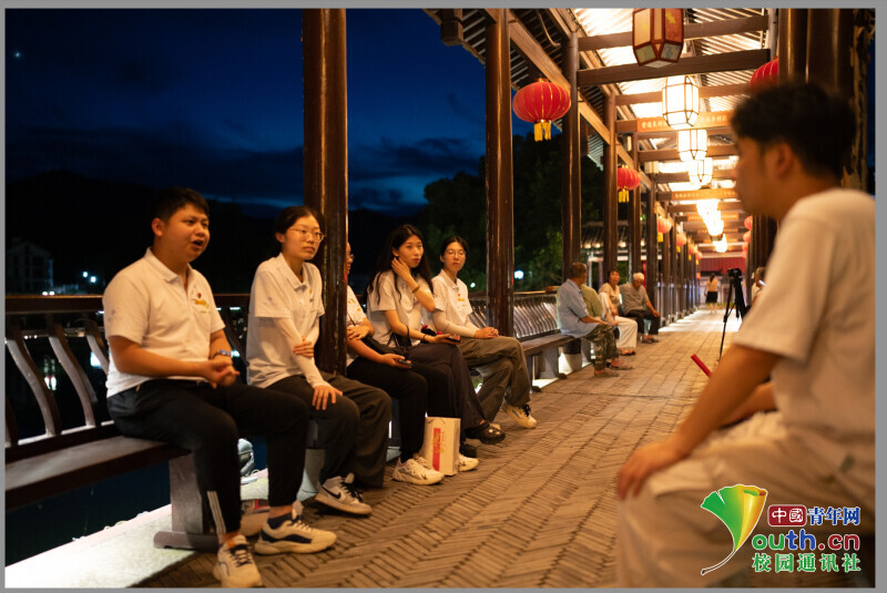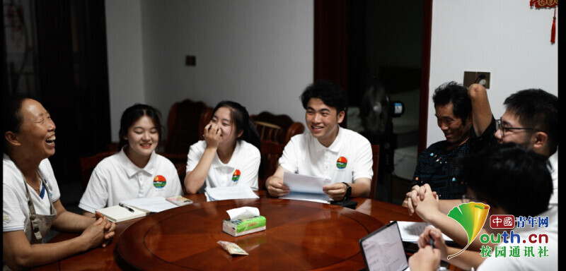 图为实践团与下姜最大私人旅游公司负责人姜丽明交谈,了解下姜村民宿行业经营现状。中国青年网通讯员 叶泽琛 摄