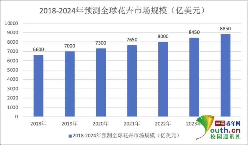 图1.2:2018-2024年预测全球花卉市场规模(亿美元)