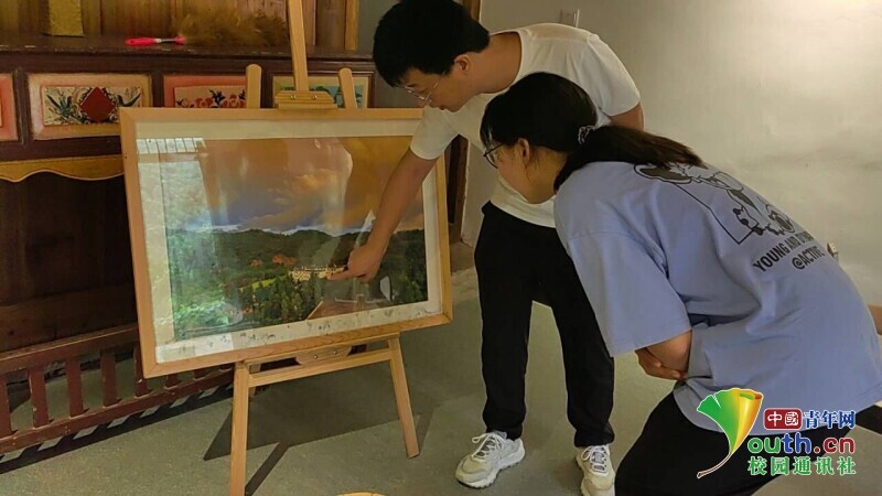 图为团队成员在民宿的文化展示馆中,了解麟潭乡林木分布情况。中国青年网通讯员 江赛金 摄