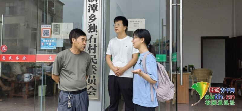 图为团队成员与独石村村委交谈了解当时宣传林业碳汇的困难与方法、学习如何调动林农意愿。 中国青年网通讯员江赛金摄