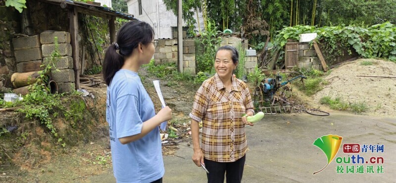 图为团队成员与当地林农交谈,了解林业碳汇发展对他们生活产生的影响。中国青年网通讯员 江赛金 摄